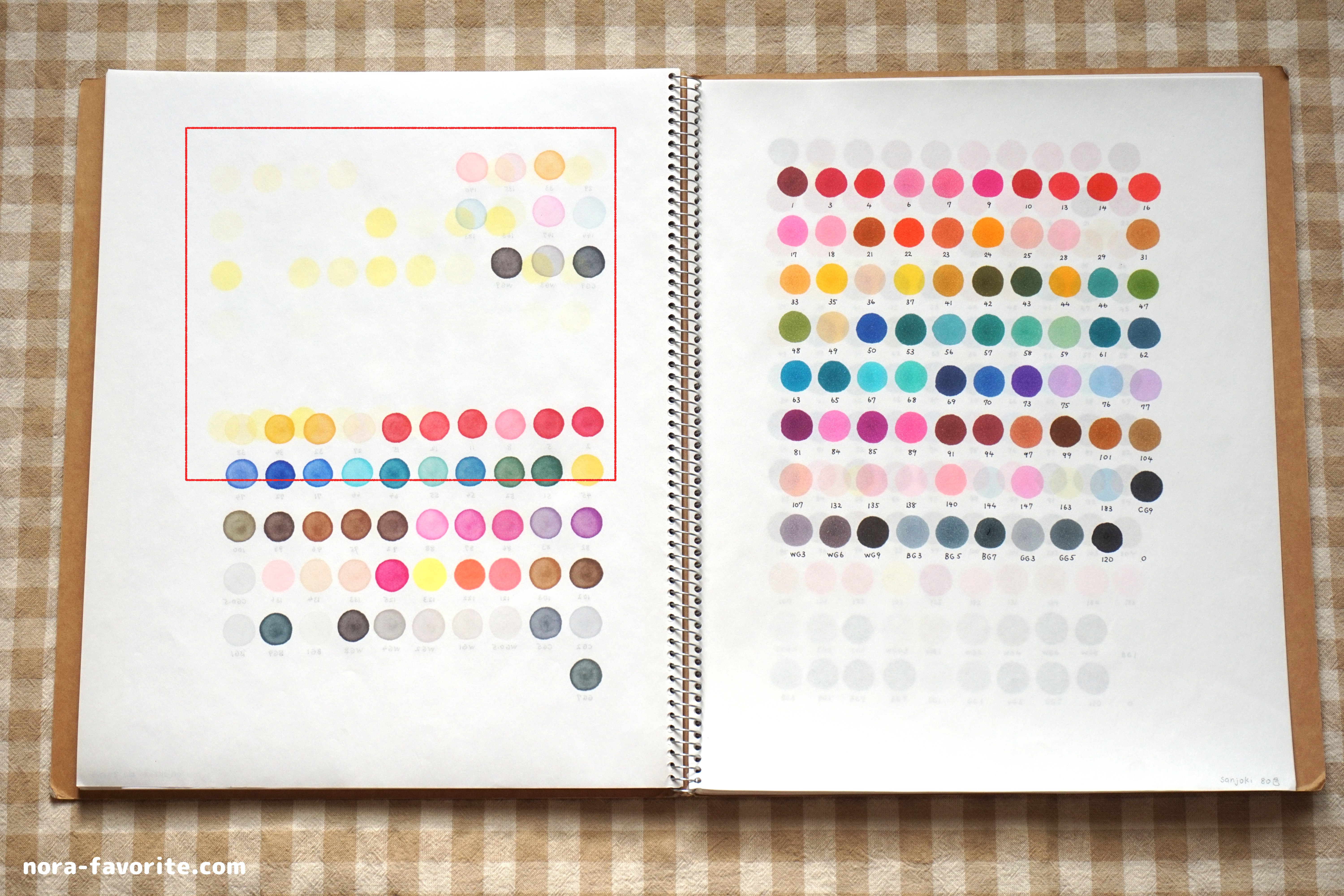 色見本を塗ったページの前ページにくっきり表れています。